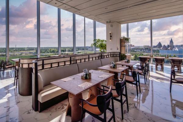 Al subir en ascensor al restaurante, en el octavo piso, se puede contemplar el Castillo de Harry Potter, la Tierra de los Minions y otros edificios de Universal Studios, bañados por la luz crepuscular, como una impresionante pintura animada.